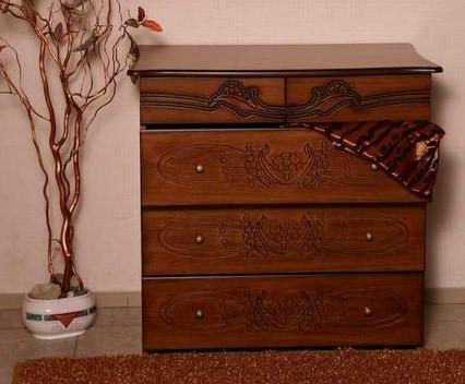 Выдвигающиеся ящики закрываются бесшумно, плотно и без просветов. Элементы ручной резьбы на фасадах выделяют их на общем плане, рисунок на ящиках и на всех дверцах располагается симметрично, поверхности обработаны аккуратно и качественно. Верхний ящик комода разделен на две секции. Цвет: дуб- рустикаль. Размер : 890*520*870