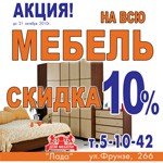Внимание! Только у нас, в Доме Мебели "ЛАДА" по ул. Фрунзе 266 (привокзальная площадь), СУПЕР АКЦИЯ!!! - скидки на весь ассортимент мебели 10%! Акция закончилась. |