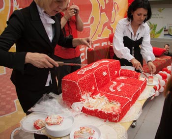Завершился праздник поеданием… дивана. Разумеется, главный приз остался цел. Просто на сцену к всеобщей радости вынесли огромный торт, сделанный в виде дивана кондитерами фабрики «Фантазия». Сотрудники компании тут же на сцене начали разрезать все это великолепие и раздавать всем желающим.