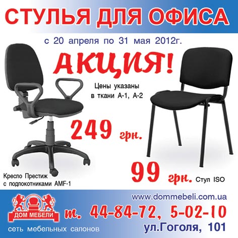 С 20 апреля по 31 мая 2012г. в салонах компании "Дім меблів" АКЦИЯ! стулья для офиса по супер ценам. СПЕШИТЕ количество ограниченно |
