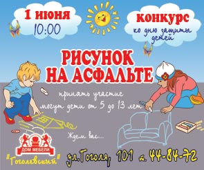В первый день лета – 1 июня – отмечают один из самых важных международных праздников – «ДЕНЬ ЗАЩИТЫ ДЕТЕЙ». В честь этого события компания «Дім меблів» организовывает детский конкурс: РИСУНОК НА АСФАЛЬТЕ на тему: «МЕБЕЛЬ глазами детей» |